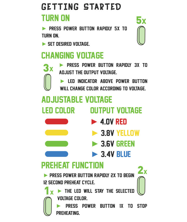 - Four Temperature Settings: Features four distinct temperature settings, allowing you to customize your vaping experience according to the specific characteristics of the oil or e-liquid.